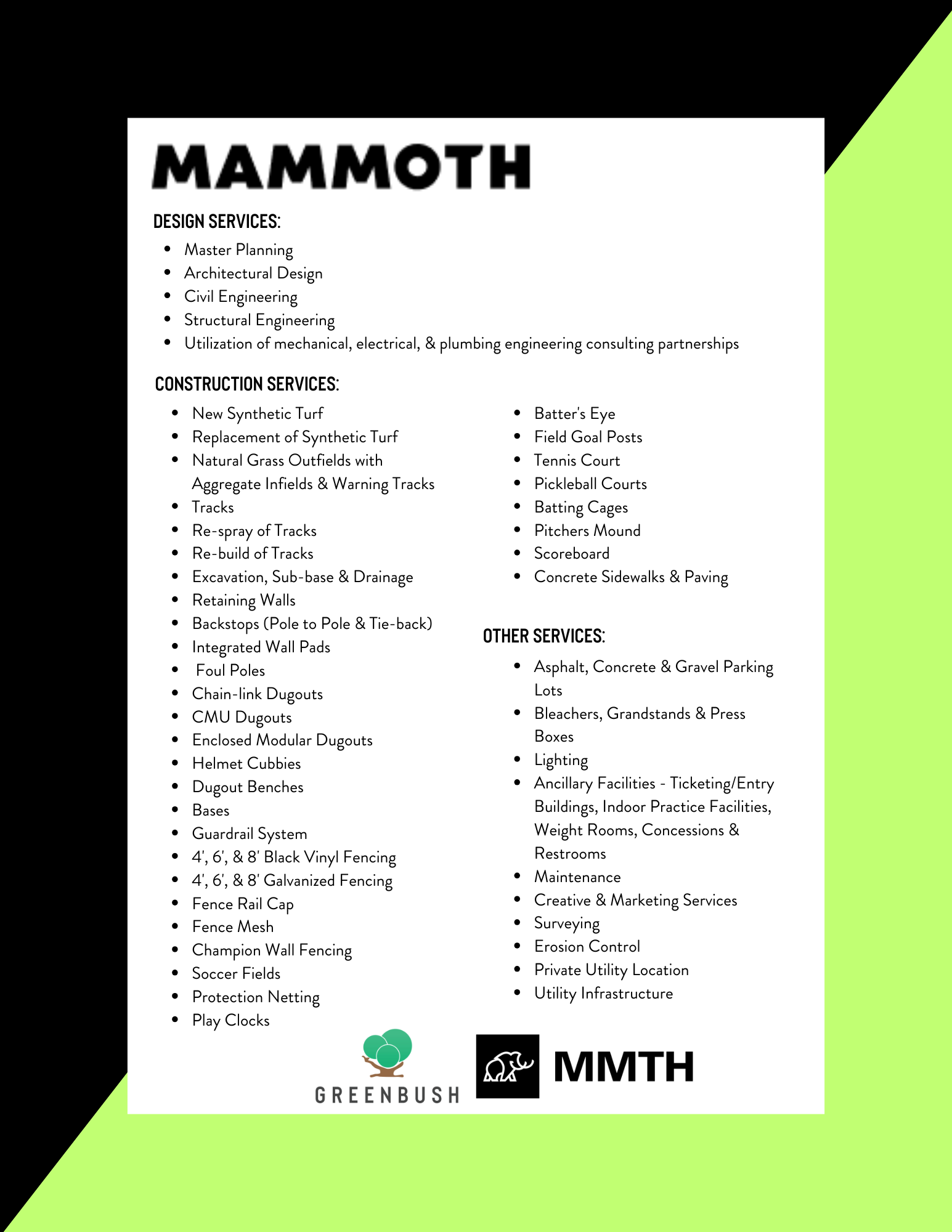 OverviewMammoth is a modern master build firm dedicated to building the places where passion and community collide. The company consults, creates, and constructs sports projects of every size. Past work includes the NFL, Big 10, SEC, Big 12, MIAA, NSIC, NAIA, GLVC, KCAC, Heart of America, and Gulf South conferences, along with thousands of high schools.